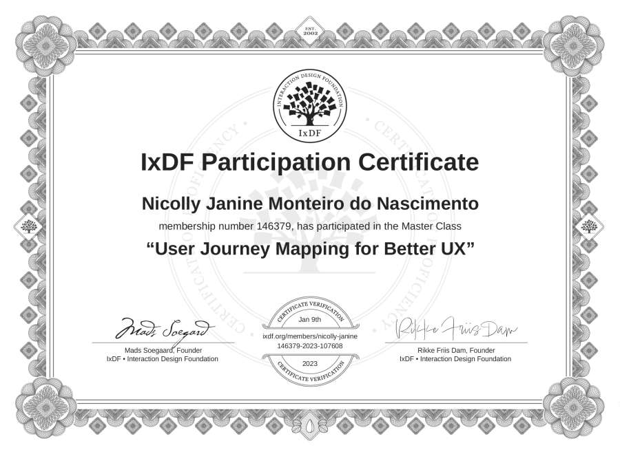 Nicolly Janine Monteiro do Nascimento's IxDF Masterclass Certificate: User Journey Mapping for Better UX