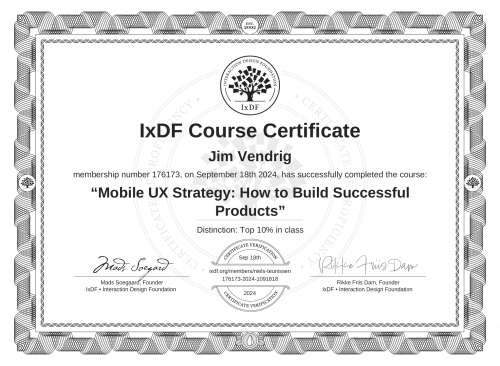 IxDF Course Certificates are awarded to Jim Vendrig in formal recognition of their coursework surpassing the rigorous benchmarks of exceptional performance established by the IxDF Educational Codex.