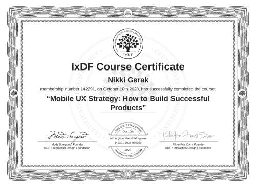 IxDF Course Certificates are awarded to Nikki Gerak in formal recognition of their coursework surpassing the rigorous benchmarks of exceptional performance established by the IxDF Educational Codex.