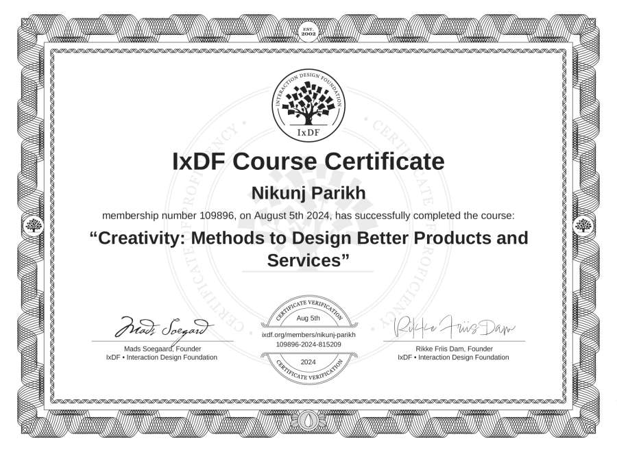 Nikunj Parikh's IxDF Course Certificate: Creativity: Methods to Design Better Products and Services