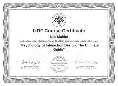 IxDF Course Certificates are awarded to Nils Mahler in formal recognition of their coursework surpassing the rigorous benchmarks of exceptional performance established by the IxDF Educational Codex.