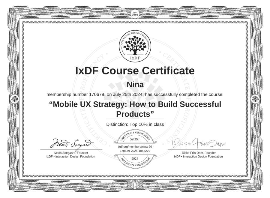 Nina's IxDF Course Certificate: Mobile UX Strategy: How to Build Successful Products