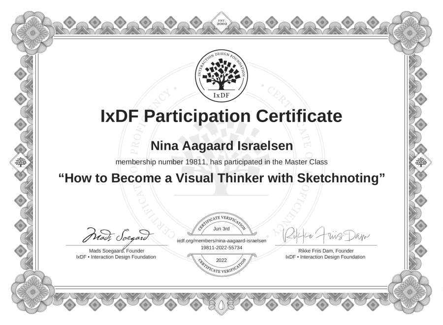 Nina Aagaard Israelsen's IxDF Masterclass Certificate: How to Become a Visual Thinker with Sketchnoting