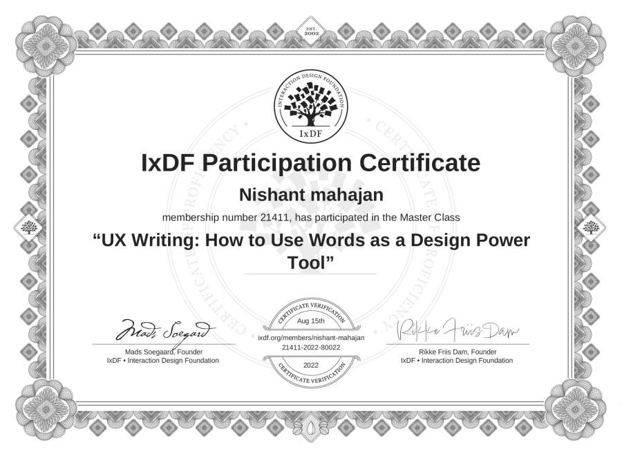 Nishant mahajan's IxDF Masterclass Certificate: UX Writing: How to Use Words as a Design Power Tool