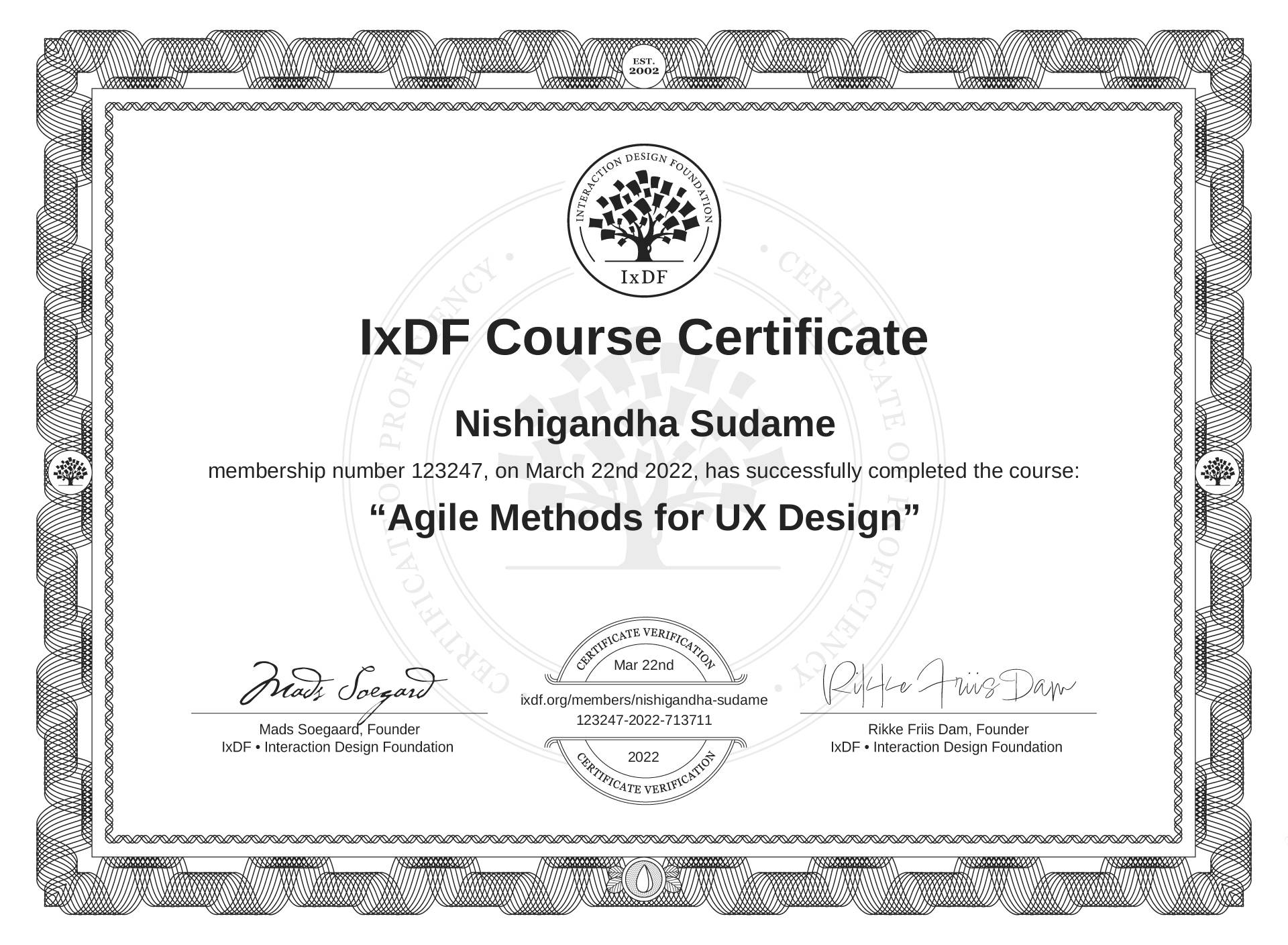 Nishigandha Sudame's IxDF Course Certificate: Agile Methods for UX Design