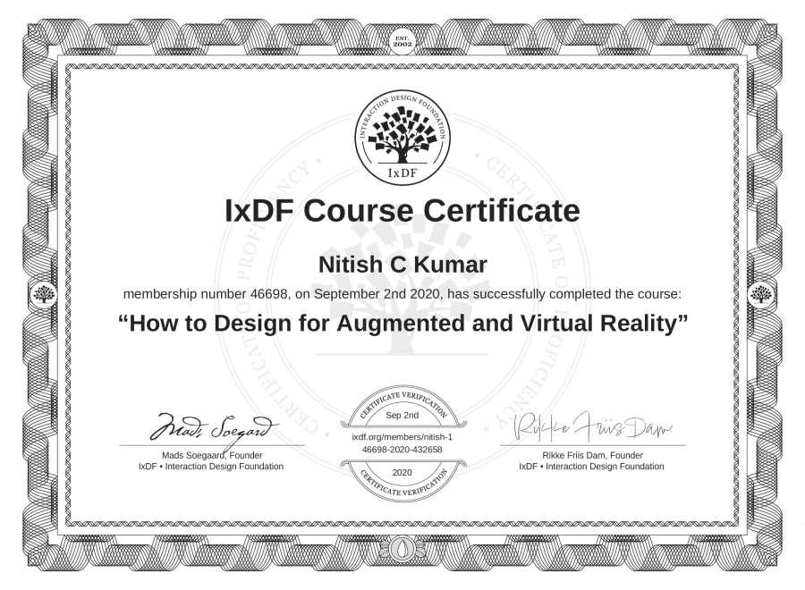 Nitish C Kumar's IxDF Course Certificate: How to Design for Augmented and Virtual Reality