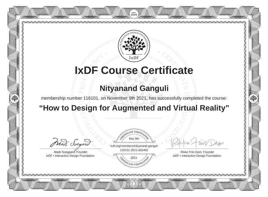 Nityanand Ganguli's IxDF Course Certificate: How to Design for Augmented and Virtual Reality