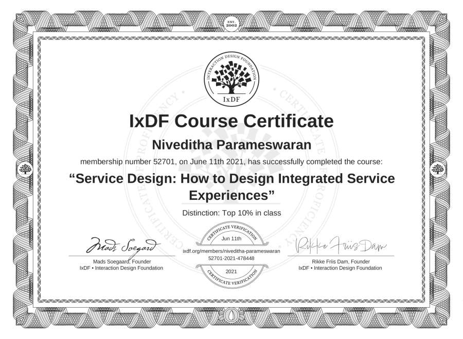 Niveditha Parameswaran's IxDF Course Certificate: Service Design: How to Design Integrated Service Experiences