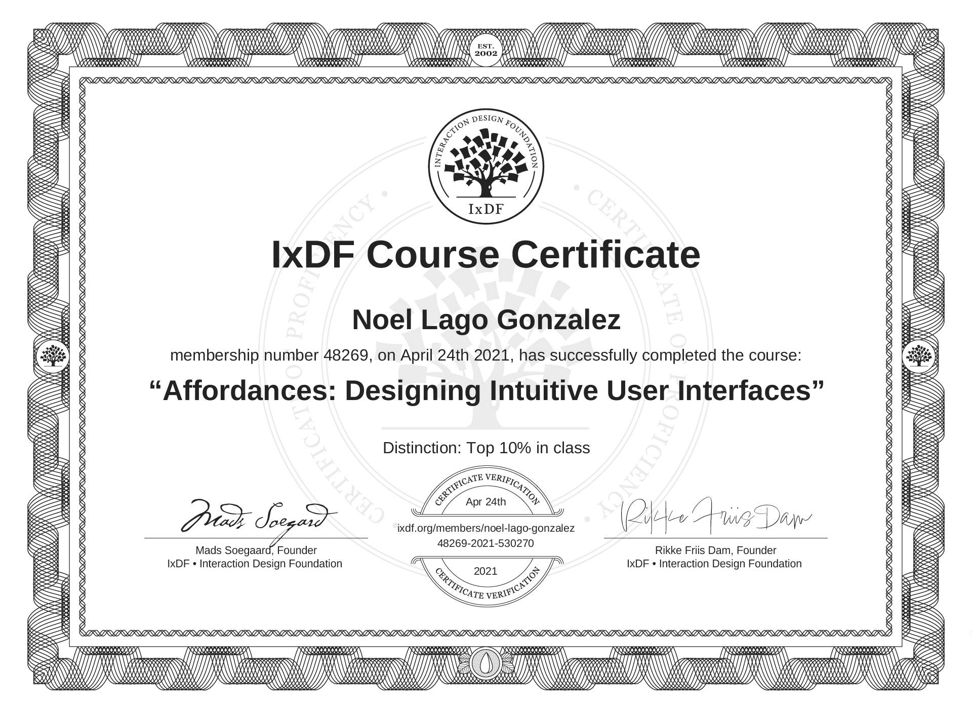The IxDF Course Certificate above is awarded to Noel Lago González with a Top 10% Distinction in formal recognition of their coursework surpassing the rigorous benchmarks of exceptional performance established by the IxDF Educational Codex.