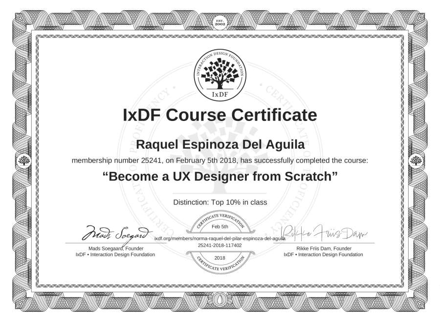 Raquel Espinoza Del Aguila's IxDF Course Certificate: Become a UX Designer from Scratch