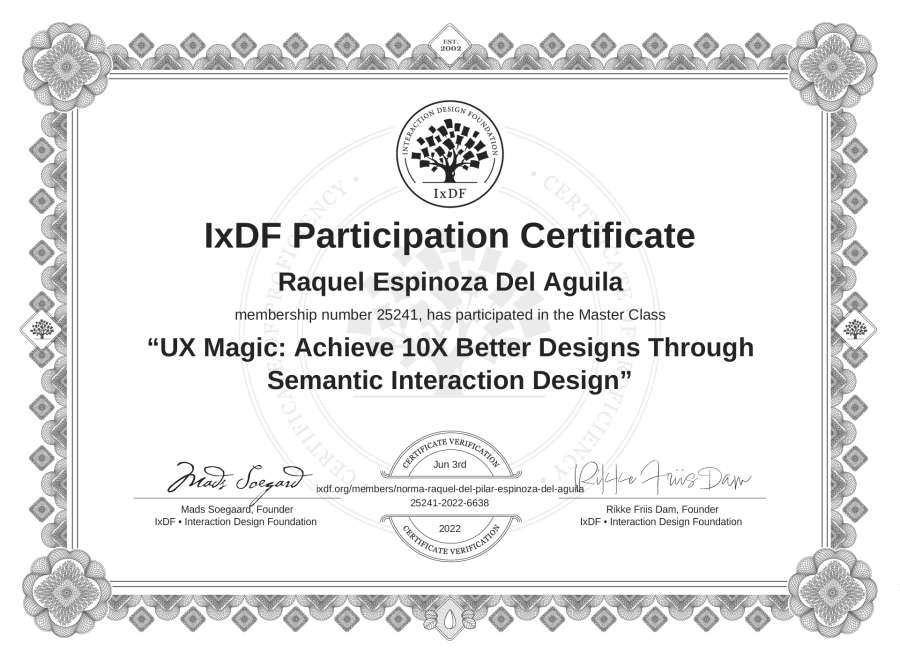 Raquel Espinoza Del Aguila's IxDF Masterclass Certificate: UX Magic: Achieve 10X Better Designs Through Semantic Interaction Design