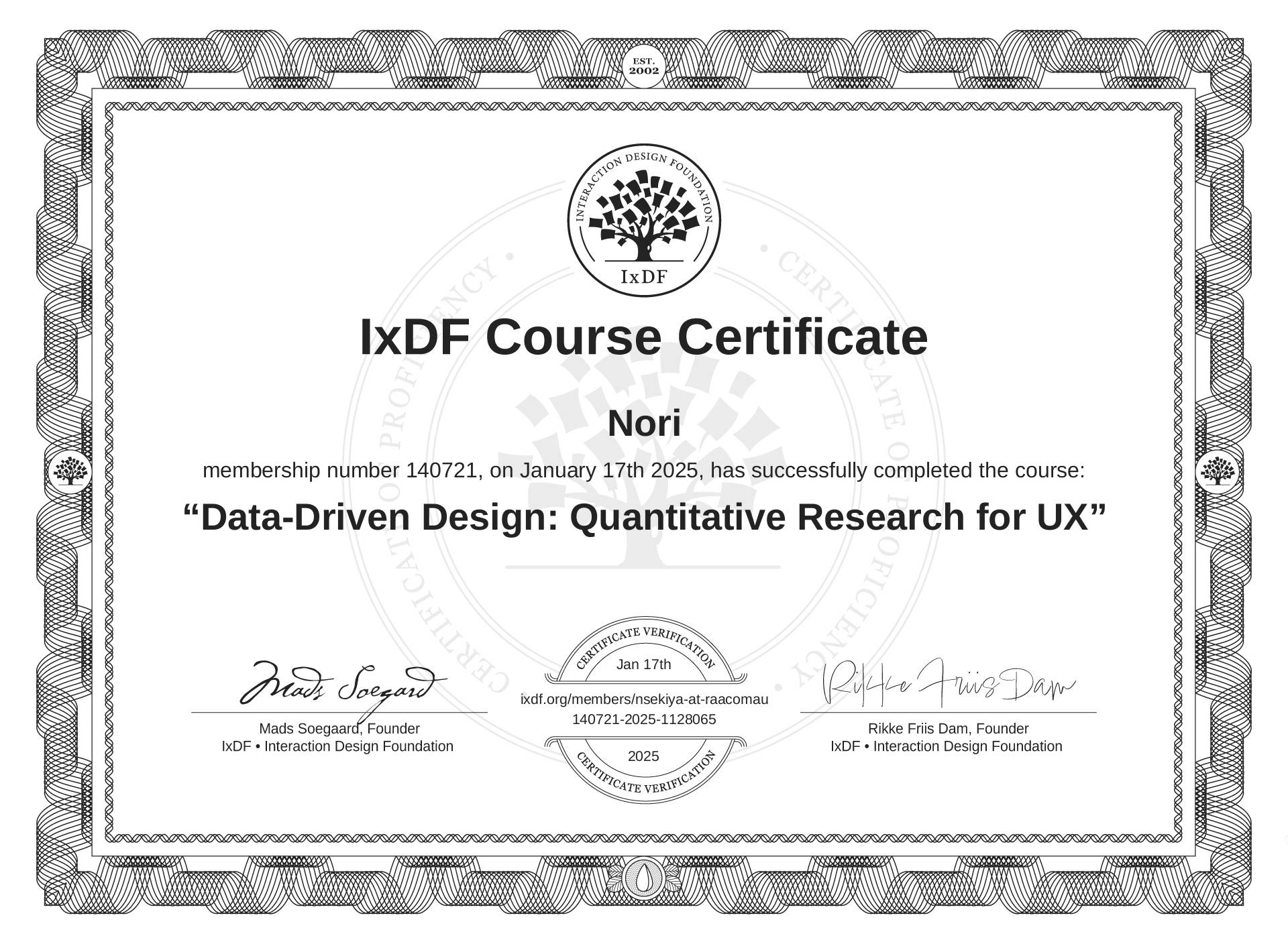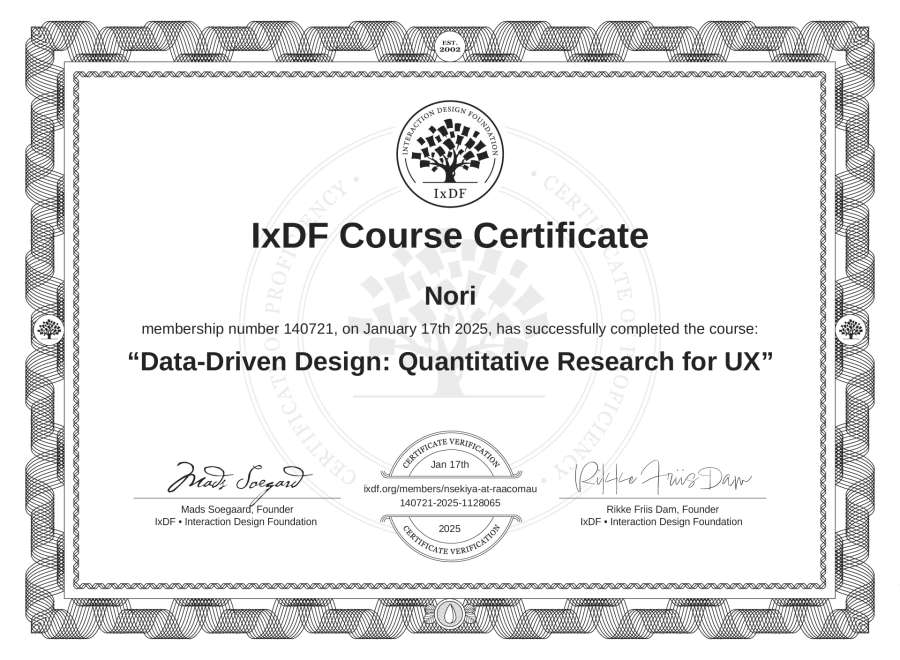 Nori's IxDF Course Certificate: Data-Driven Design: Quantitative Research for UX