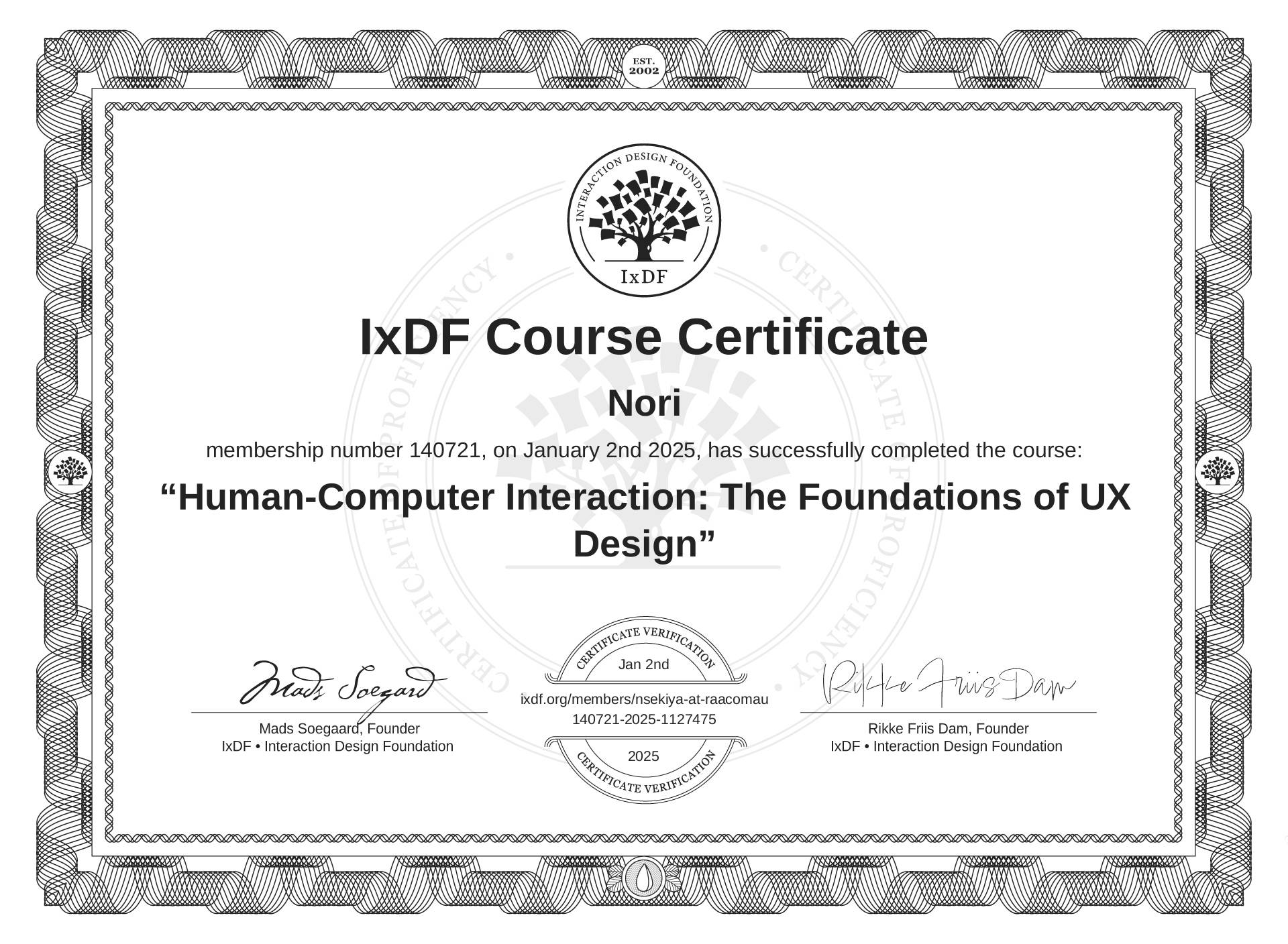 Nori's IxDF Course Certificate: Human-Computer Interaction: The Foundations of UX Design