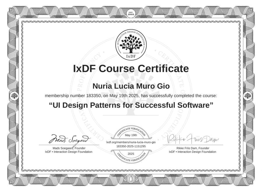 Nuria Lucia Muro Gio's IxDF Course Certificate: UI Design Patterns for Successful Software
