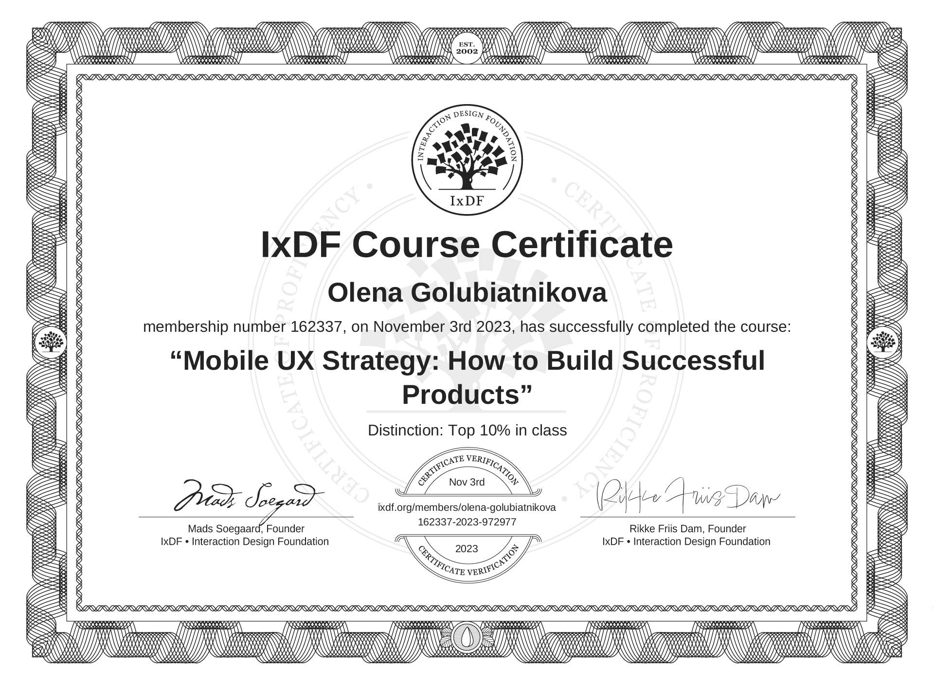 The IxDF Course Certificate above is awarded to Olena Golubiatnikova with a Top 10% Distinction in formal recognition of their coursework surpassing the rigorous benchmarks of exceptional performance established by the IxDF Educational Codex.