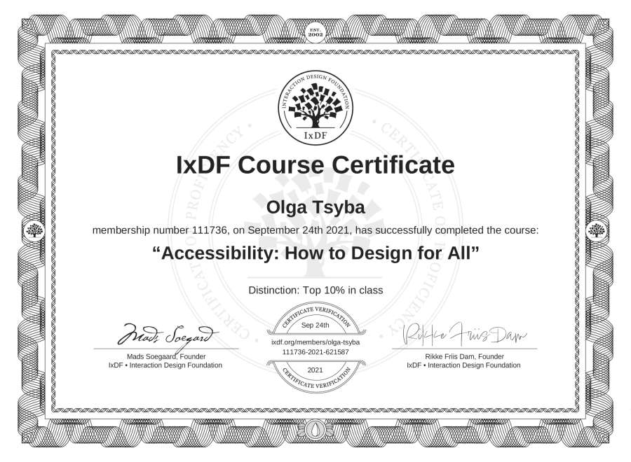 Olga Tsyba's IxDF Course Certificate: Accessibility: How to Design for All