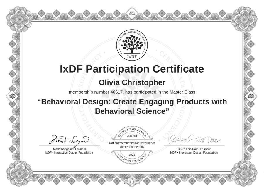 Olivia Christopher's IxDF Masterclass Certificate: Behavioral Design: Create Engaging Products with Behavioral Science
