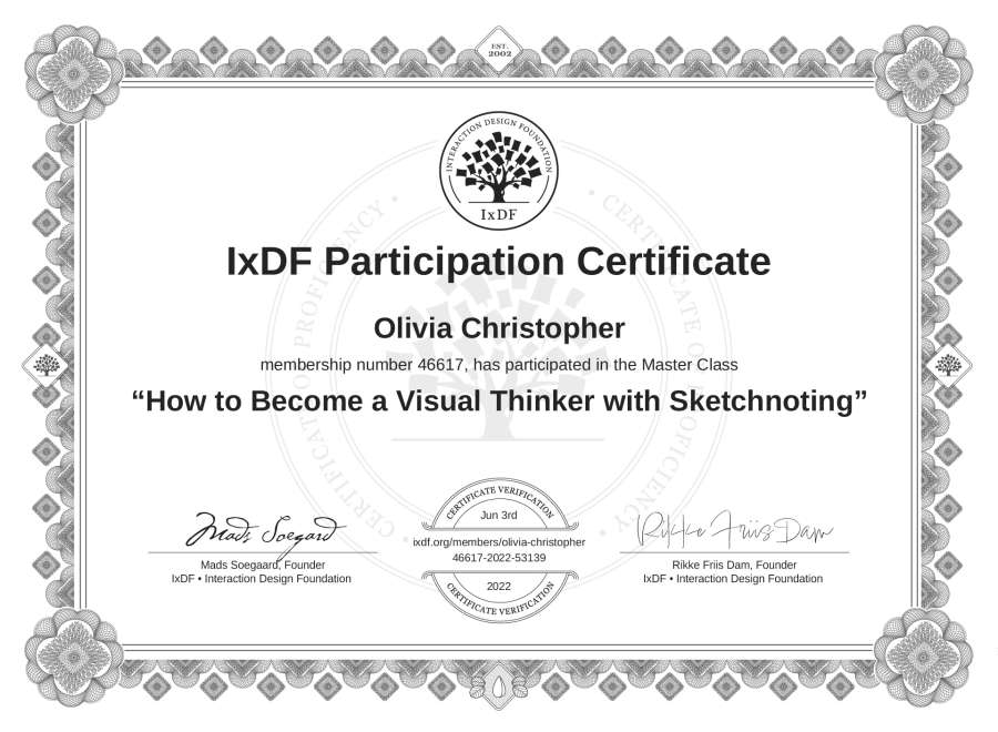 Olivia Christopher's IxDF Masterclass Certificate: How to Become a Visual Thinker with Sketchnoting