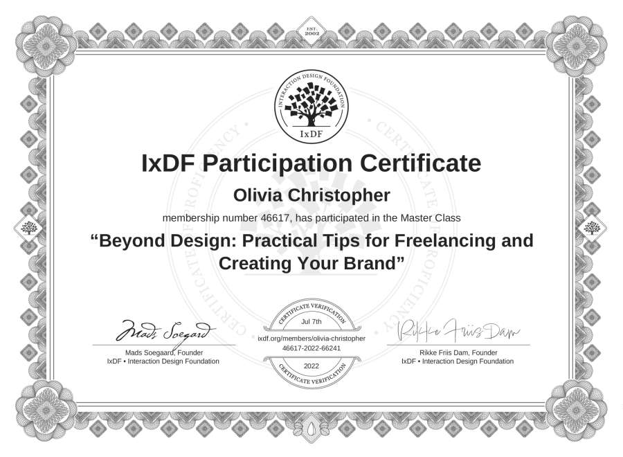 Olivia Christopher's IxDF Masterclass Certificate: Beyond Design: Practical Tips for Freelancing and Creating Your Brand