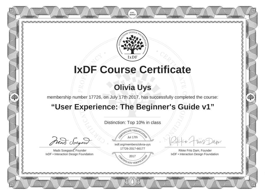The IxDF Course Certificate above is awarded to Olivia Uys with a Top 10% Distinction in formal recognition of their coursework surpassing the rigorous benchmarks of exceptional performance established by the IxDF Educational Codex.