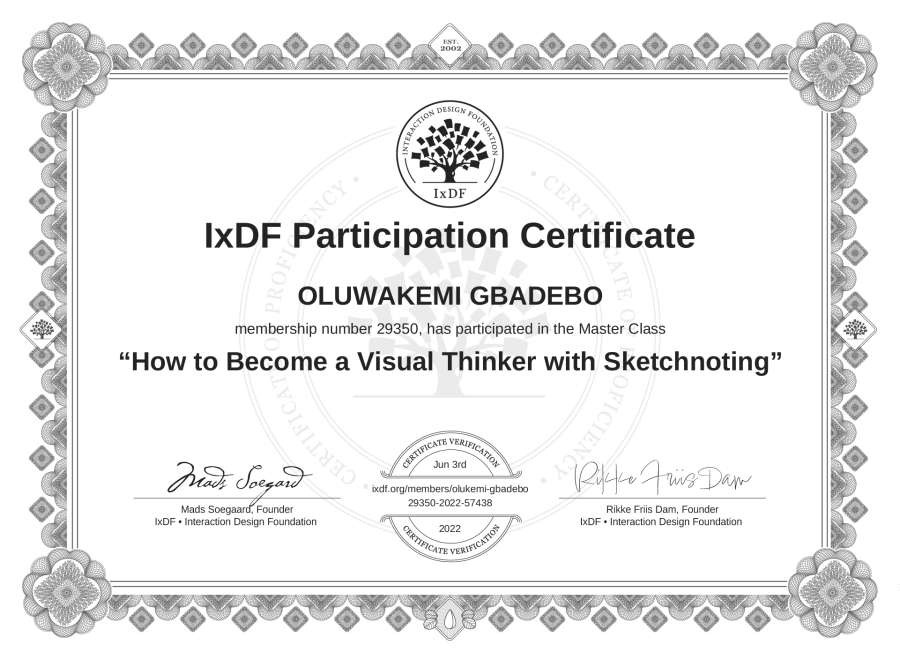 OLUWAKEMI GBADEBO's IxDF Masterclass Certificate: How to Become a Visual Thinker with Sketchnoting