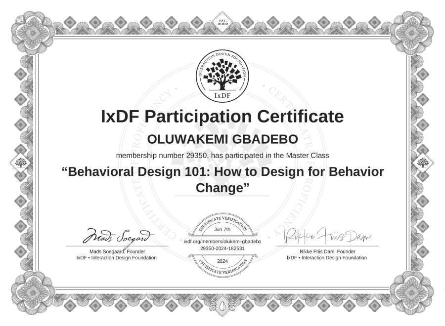OLUWAKEMI GBADEBO's IxDF Masterclass Certificate: Behavioral Design 101: How to Design for Behavior Change