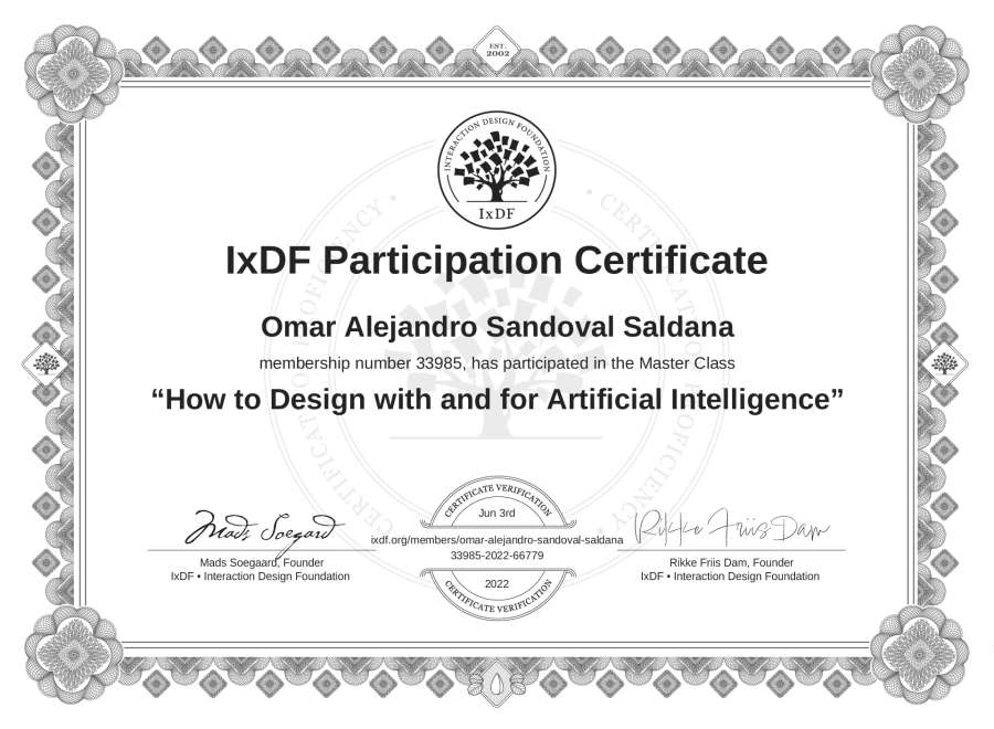 Omar Alejandro Sandoval Saldaña's IxDF Masterclass Certificate: How to Design with and for Artificial Intelligence