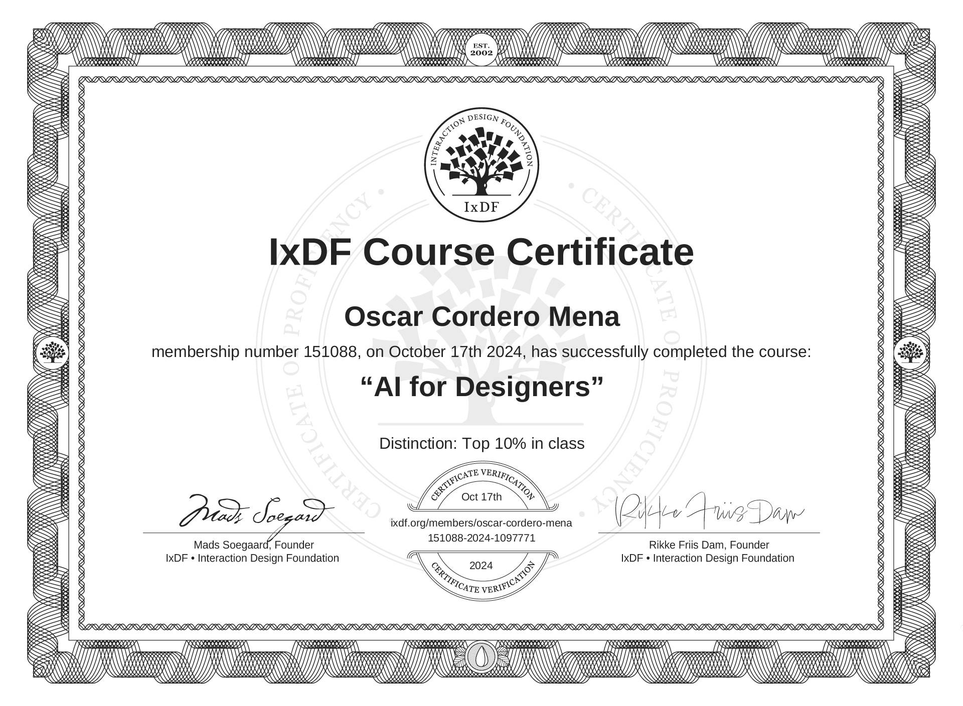 The IxDF Course Certificate above is awarded to Oscar Cordero Mena with a Top 10% Distinction in formal recognition of their coursework surpassing the rigorous benchmarks of exceptional performance established by the IxDF Educational Codex.