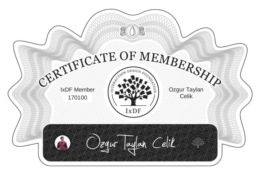 The Membership Certificate below verifies that Özgür Taylan Çelik is a member of Interaction Design Foundation.