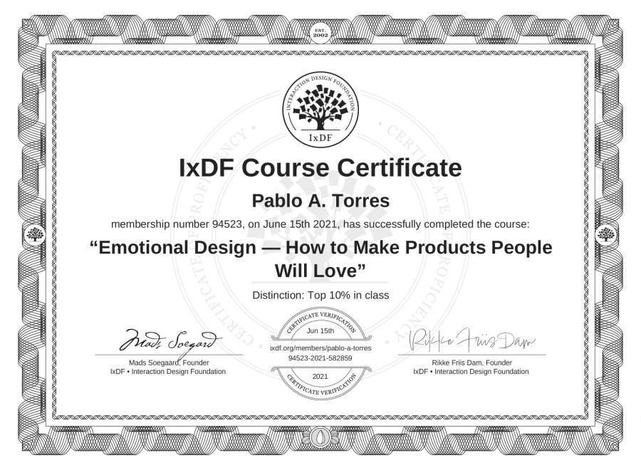Pablo A. Torres's IxDF Course Certificate: Emotional Design — How to Make Products People Will Love