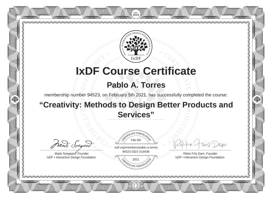 Pablo A. Torres's IxDF Course Certificate: Creativity: Methods to Design Better Products and Services