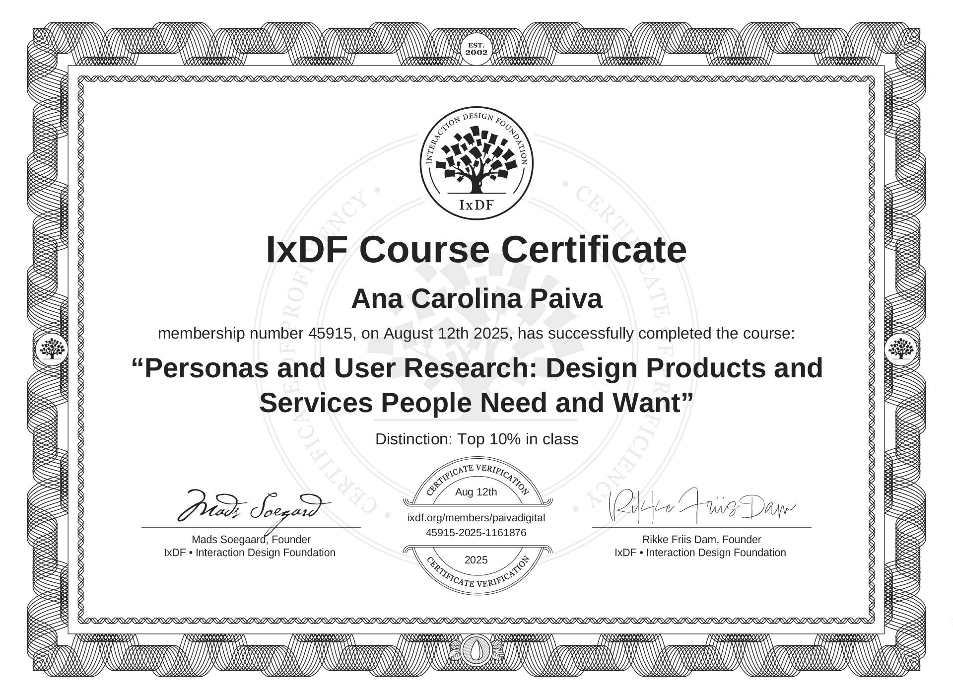 The IxDF Course Certificate above is awarded to Ana Carolina Paiva with a Top 10% Distinction in formal recognition of their coursework surpassing the rigorous benchmarks of exceptional performance established by the IxDF Educational Codex.