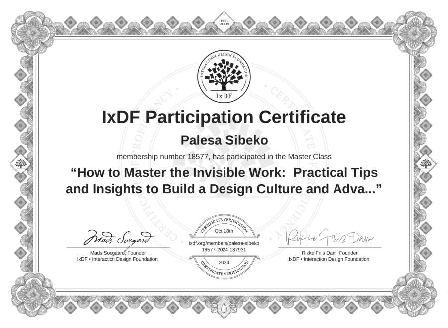 Palesa Sibeko's IxDF Masterclass Certificate: How to Master the Invisible Work: Practical Tips and Insights to Build a Design Culture and Advance Your Career