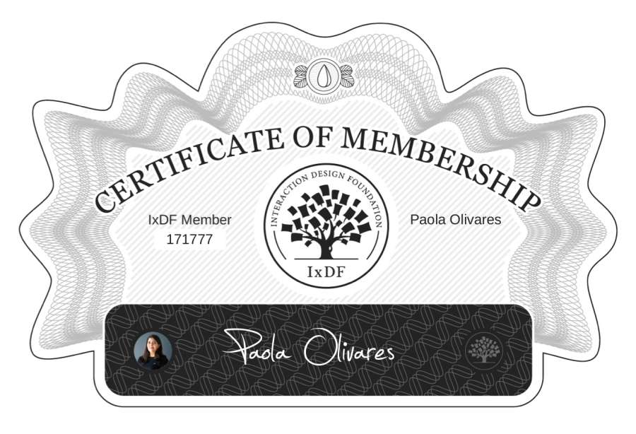 The Membership Certificate below verifies that Paola Olivares is a member of Interaction Design Foundation.