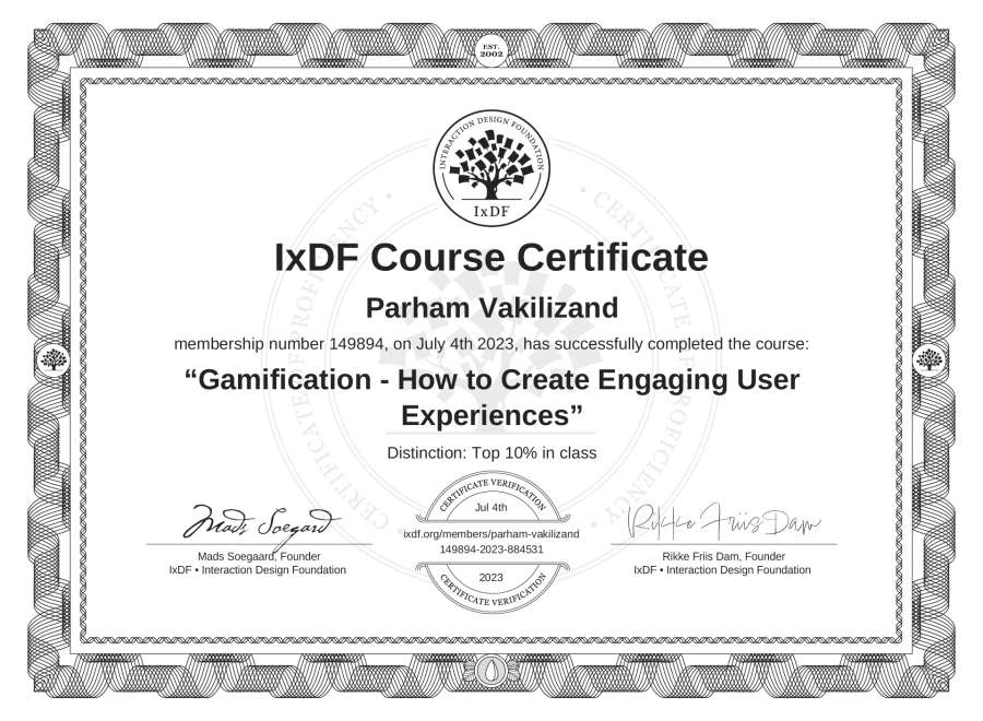 Parham Vakilizand's IxDF Course Certificate: Gamification - How to Create Engaging User Experiences