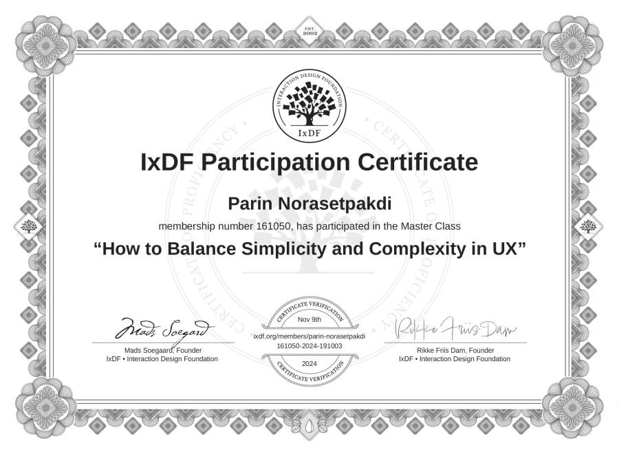 Parin Norasetpakdi's IxDF Masterclass Certificate: How to Balance Simplicity and Complexity in UX