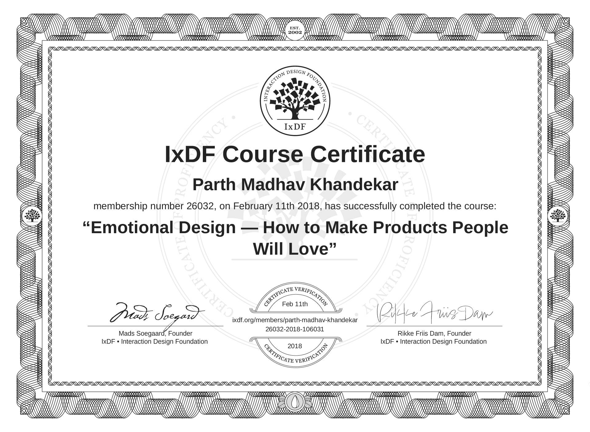 Parth Madhav Khandekar's IxDF Course Certificate: Emotional Design — How to Make Products People Will Love