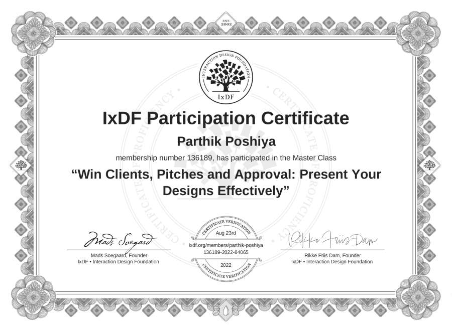 Parthik Poshiya's IxDF Masterclass Certificate: Win Clients, Pitches and Approval: Present Your Designs Effectively