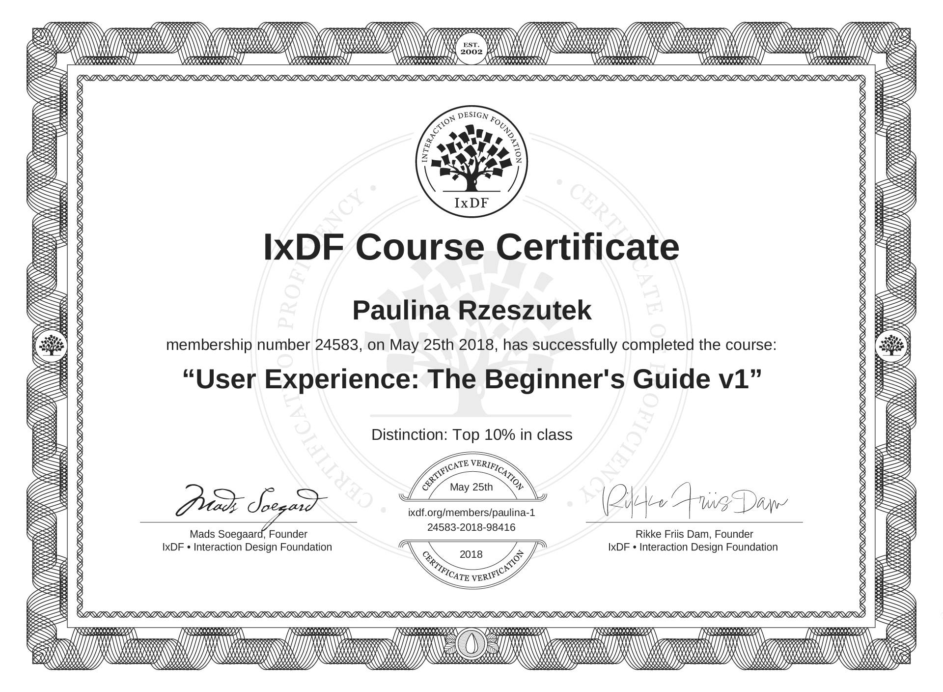 Paulina Rzeszutek's IxDF Course Certificate: User Experience: The Beginner's Guide v1