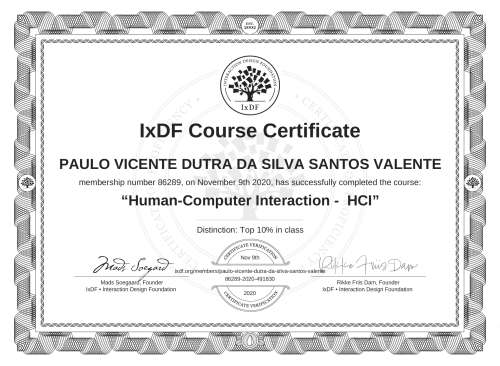 IxDF Course Certificates are awarded to PAULO VICENTE DUTRA DA SILVA SANTOS VALENTE in formal recognition of their coursework surpassing the rigorous benchmarks of exceptional performance established by the IxDF Educational Codex.
