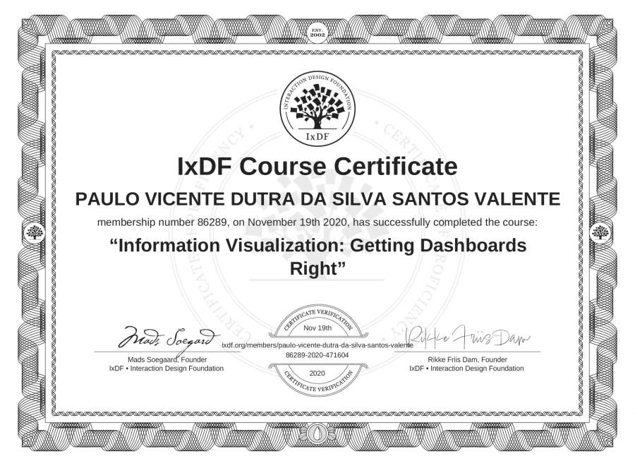 PAULO VICENTE DUTRA DA SILVA SANTOS VALENTE's IxDF Course Certificate: Information Visualization: Getting Dashboards Right