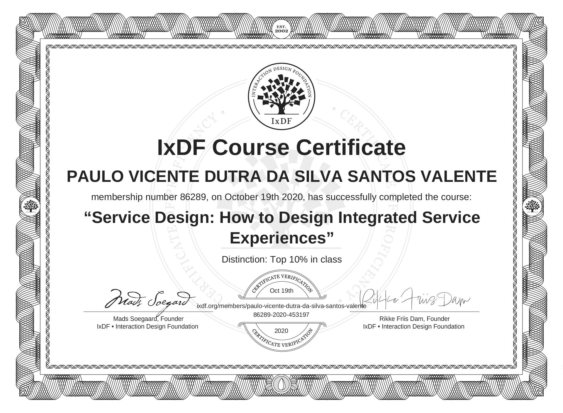 The IxDF Course Certificate above is awarded to PAULO VICENTE DUTRA DA SILVA SANTOS VALENTE with a Top 10% Distinction in formal recognition of their coursework surpassing the rigorous benchmarks of exceptional performance established by the IxDF Educational Codex.
