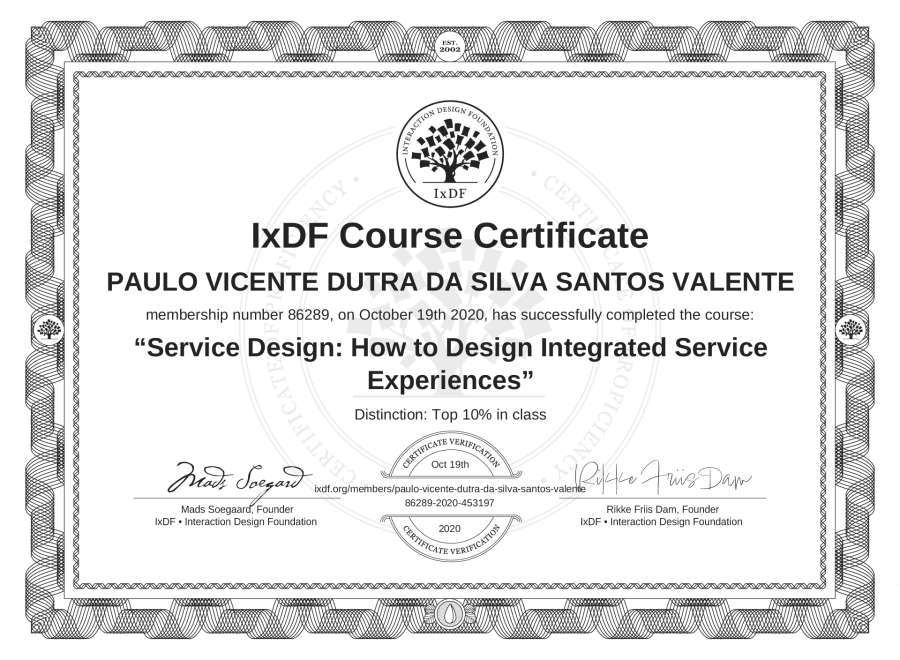 PAULO VICENTE DUTRA DA SILVA SANTOS VALENTE's IxDF Course Certificate: Service Design: How to Design Integrated Service Experiences
