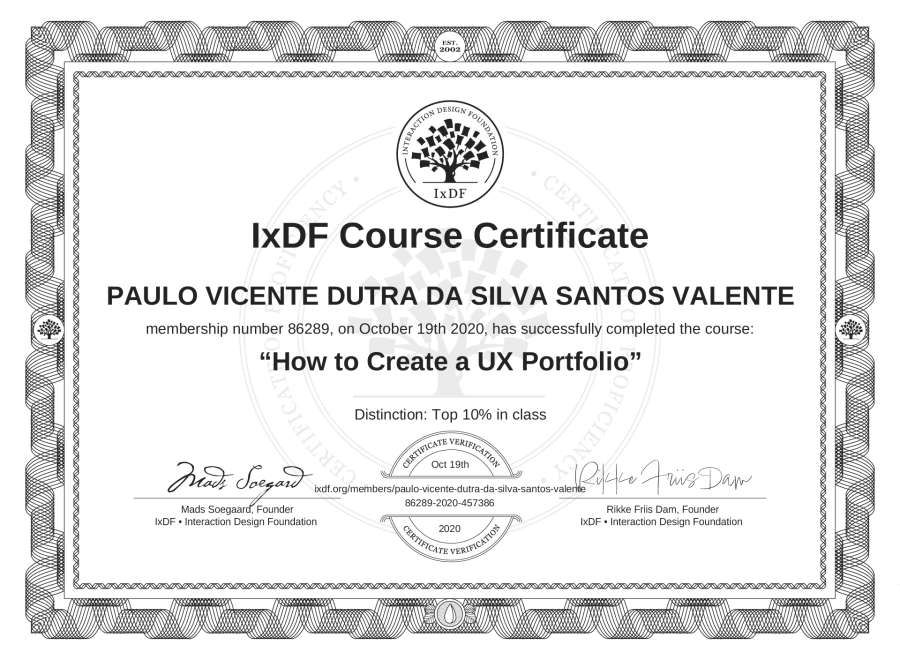 PAULO VICENTE DUTRA DA SILVA SANTOS VALENTE's IxDF Course Certificate: How to Create a UX Portfolio