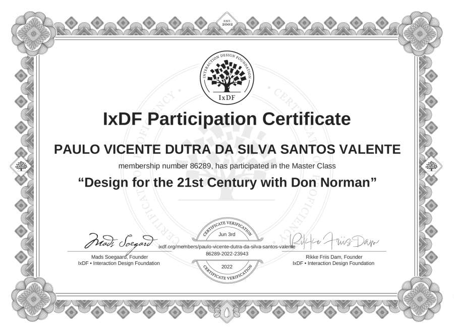 PAULO VICENTE DUTRA DA SILVA SANTOS VALENTE's IxDF Masterclass Certificate: Design for the 21st Century with Don Norman