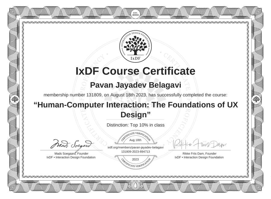 Pavan Jayadev Belagavi's IxDF Course Certificate: Human-Computer Interaction: The Foundations of UX Design