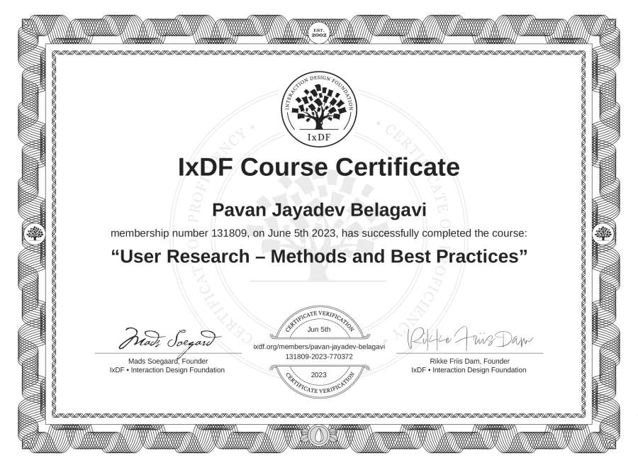 Pavan Jayadev Belagavi's IxDF Course Certificate: User Research – Methods and Best Practices