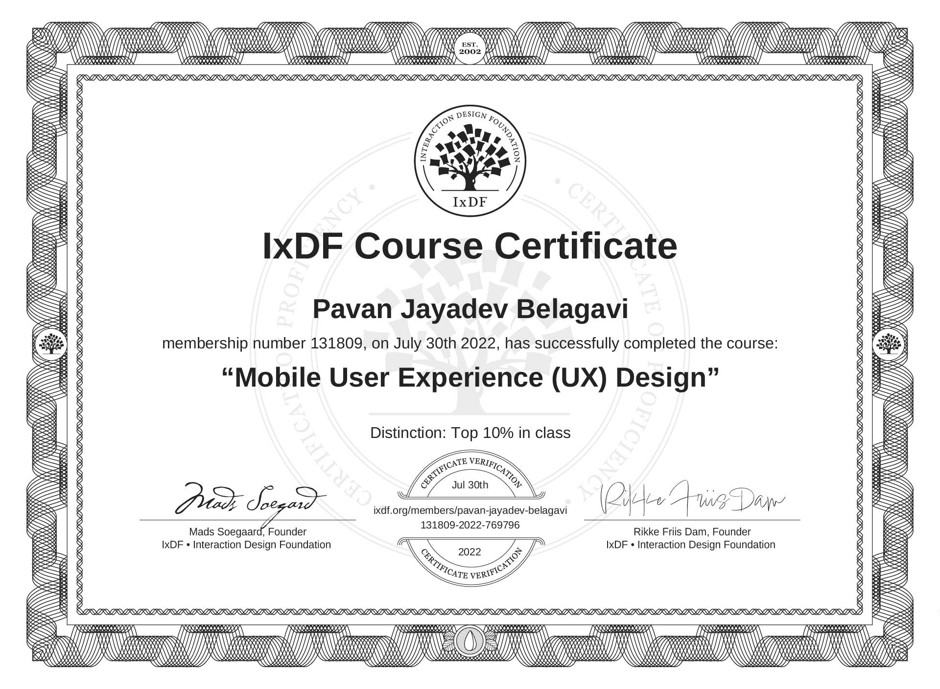 The IxDF Course Certificate above is awarded to Pavan Jayadev Belagavi with a Top 10% Distinction in formal recognition of their coursework surpassing the rigorous benchmarks of exceptional performance established by the IxDF Educational Codex.