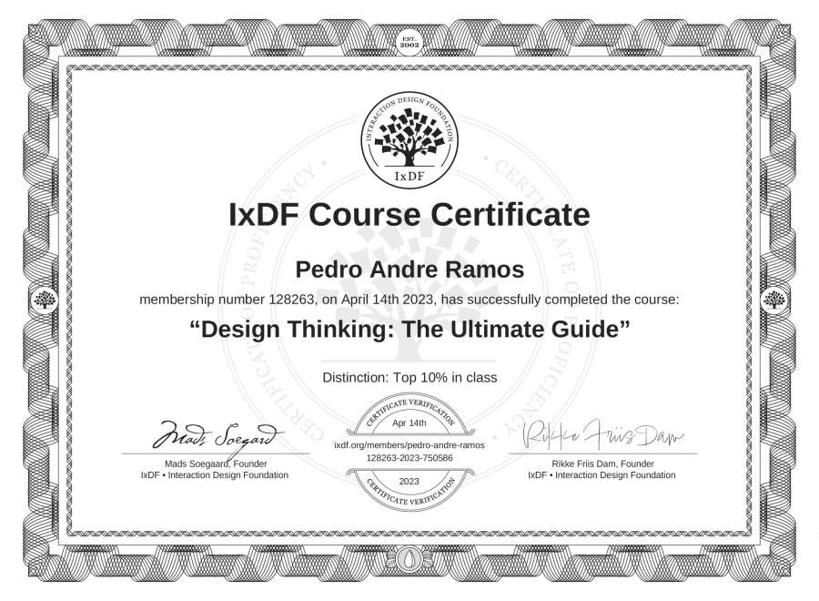 The IxDF Course Certificate above is awarded to Pedro Andre Ramos with a Top 10% Distinction in formal recognition of their coursework surpassing the rigorous benchmarks of exceptional performance established by the IxDF Educational Codex.