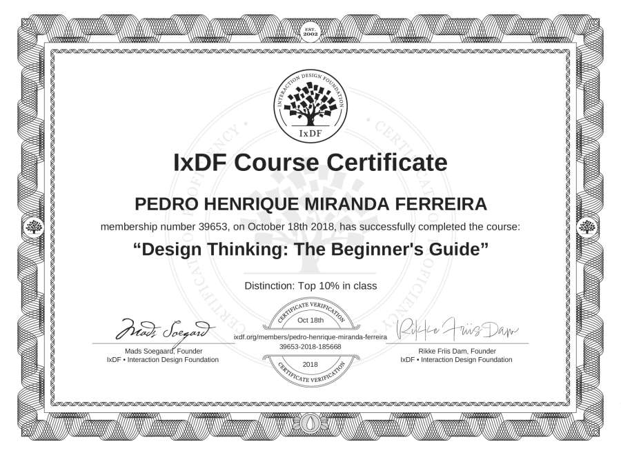 PEDRO HENRIQUE MIRANDA FERREIRA's IxDF Course Certificate: Design Thinking: The Beginner's Guide